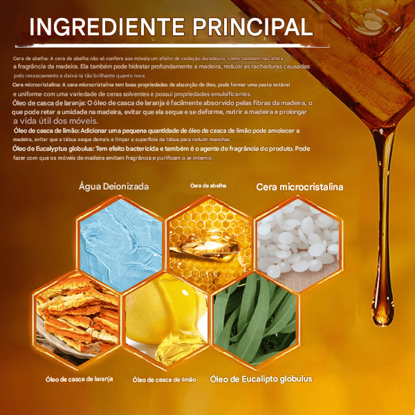 Saudável e Brilhante: O Spray de Cera de Abelha é feito de cera de abelha natural, que mantém sua madeira saudável e brilhante. Não contém produtos químicos ou resíduos nocivos, então você pode usá-lo com confiança. Sua madeira ficará úmida e brilhante, graças à cera de abelha natural.