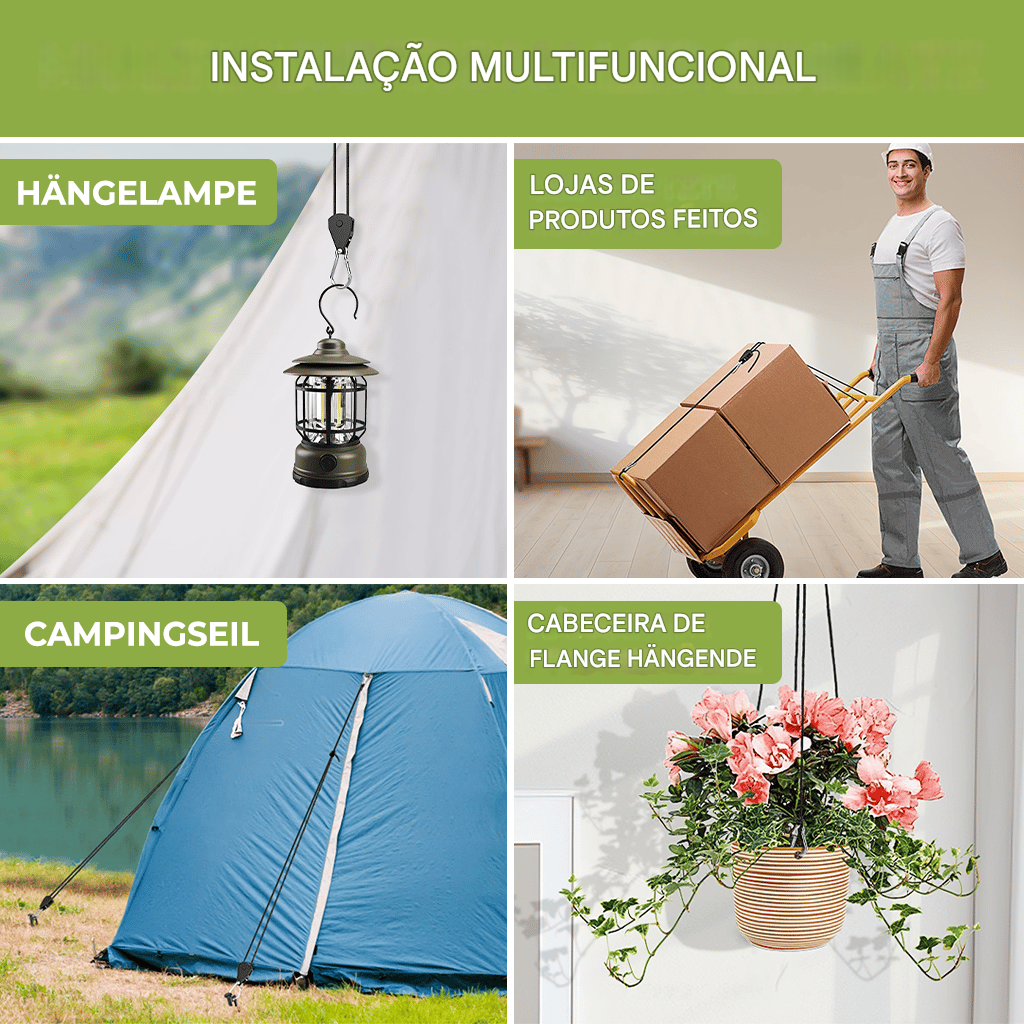 Design do sistema de polias: basta puxar para prender! Nosso inovador sistema de polias permite prender a corda com um puxão suave, tornando a instalação rápida e fácil! 🚀🔒